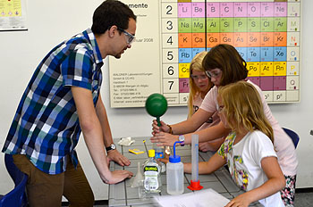 Das NaWigator Team des RWG hatte die 3. Klassen der Weidenberger Grundschule und der Grundschule Herzoghöhe zu einem Experimentier-Vormittag eingeladen. Gespannt und voller Erwartung betraten die Drittklässler die Laborräume der Schule. In Viererteams besuchten sie nacheinander Experimentierstationen aus der Biologie, Chemie und Physik. Mit Begeisterung wurden die Versuche durchgeführt. Eine Brausetablette, die einen Luftballon aufpustet, konnte an der Chemiestation erforscht werden. In der Physik verglichen die Schüler den freien Fall einer Daunenfeder und einer Eisenkugel miteinander und brachten durch Muskelkraft einen Schokokuss zum Wachsen, ohne ihn zu berühren. Verblüffend oder?