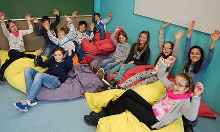 Im Zimmer der Klasse 5b sind die grellgelben, blauen und orangen Säcke bei allen beliebt – es sind prima Möbel zum Wohlfühlen und für Kinder wie gemacht.