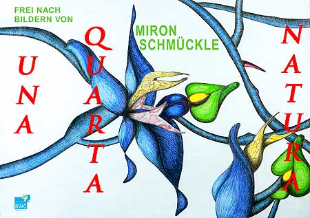 Die Ausstellung steht unter dem Motto „Una Quatra Natura“. Die Arbeiten, die gezeigt werden, entstanden im Anschluss an eine Ausstellung des Künstlers Miron Schmückle, die im Sommer letzten Jahres im Kunstmuseum zu sehen waren. Schmückle, der aus Rumänien stammt, kombiniert aus verschiedenen Pflanzenmotiven einen kreativen Phantasie-Dschungel, der eine farbenfrohe Abstraktion darstellt. Auf den ersten Blick kann man nicht sagen, ob es Pflanzen oder Tiere sind, welche dargestellt werden, denn sie sind zu einem bunten Motivteppich kombiniert. Für Schmückle ist dies „Terza Natura“, die „dritte Natur“, die, wenn man dem italienischen Humanisten Jacopo Bonfadio (1508-1550) folgt, die ursprüngliche, unzivilisierte Wildnis als „erste Natur“ und die „zweiten Natur“ der Gärten und Blumenarrangements ergänzt.