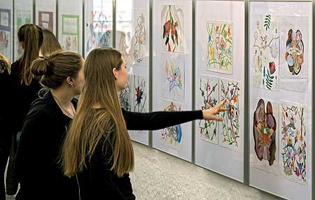 Weil es in der Schule auch um das Lernen geht, wurden die Schüler zu ihren Kunstwerken auch angeleitet. Dazu gehört zum einen die Beschriftung der dargestellten Pflanzen, zum anderen auch die handwerkliche Unterweisung. Anne Gerdes Eröffnungsrede gab einen aufschlussreichen Einblick in das Arbeiten im Kunstunterricht: Den Schülern sei gezeigt worden, dass man sich bei der Arbeit mit den Buntstiften stets schichtend vorarbeiten müsse, bis der richtige Farbton aus zwei oder mehreren Farben gemischt sei und der eine Farbton satt glänze, damit der Farbton den Betrachter der „Schülerübung“ überzeugen könne. Auch Ordnung kann der Komposition eines Kunstwerkes gut tun. Die Schüler wurden deshalb ermutigt, bei ihren Bildern eine Spiegelachse anzulegen als Strukturhilfe, von der man im Detail auch wieder abweichen konnte.