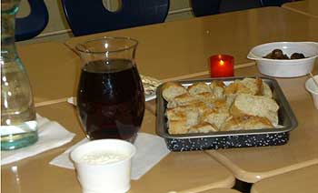 Das kurzerhand zum römischen triclinium, einem Speisezimmer, umfunktionierte Klassenzimmer der 6a bot dann die Hintergrundkulisse für eine wahrhaftig üppig ausgestattete römische cena: Es gab panis (Weißbrot, Ciabatta, Grissini), oleae (Oliven), caseus (Käse), uvae (Trauben), römische Kekse und Knabbereien und vieles mehr. An Getränken standen aqua (Wasser) in der Karaffe sowie vinum (‚Wein‘ = Traubensaft) und der Göttertrank ambrosia (Granatapfelsaft) bereit.