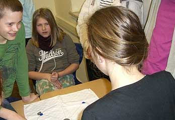 Nachdem sich alle ausgiebig verpflegt hatten, widmete man sich den Freizeitbeschäftigungen im alten Rom: Nun gab es verschiedene Spiele auszuprobieren, wie z.B. Rundmühle, das ähnlich wie das heutige Brettspiel gespielt wurde, allerdings mit weißen und schwarzen Kieseln als Spielsteinen. In einer anderen Ecke des Zimmers fanden sich Schüler/innen zum orca-Spiel zusammen, bei dem mit Haselnüssen in eine dünnhalsige antike Vase gezielt werden musste.