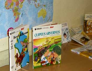 Wer sich nebenbei über römische Themen in Sachbüchern und Kinder- und Jugendbüchern informieren wollte, konnte in der Bücherecke an einer Seite des Zimmers fündig werden. Hier durfte u.a. auch Asterix (in lateinischer Sprache) nicht fehlen.