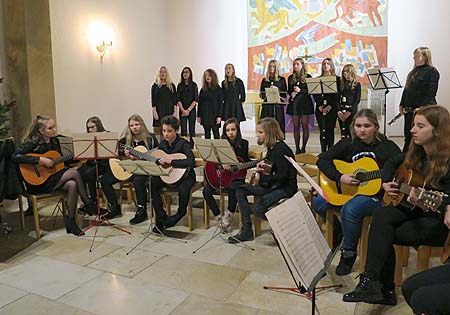 Der Chor der Unterstufe, die Gitarren- und die Flötengruppe hatten einen ebenso abwechslungsreichen wie feierlichen Reigen aus bekannten Weihnachtsliedern vorbereitet. „Es kommt ein Schiff geladen“, „In dulci jubilo“, „Maria durch den Dornwald ging“ oder „Herbei o ihr Gläubigen“ hat jeder schon einmal gehört, aber bestimmt nicht so schön wie aus den Kehlen oder den Instrumenten unserer RWG-Schüler.