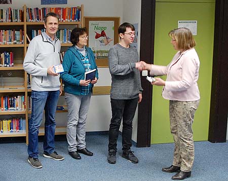 Frau Graf, Frau Bachmann und Herr Dr. Rusam bedankten sich bei Jannis mit einer Tafel RWG-Schokolade und dem Buch „Lust auf Theologie“ von Dr. Rusam, da Jannis nach seinem Abitur auch evangelische Theologie studieren möchte.