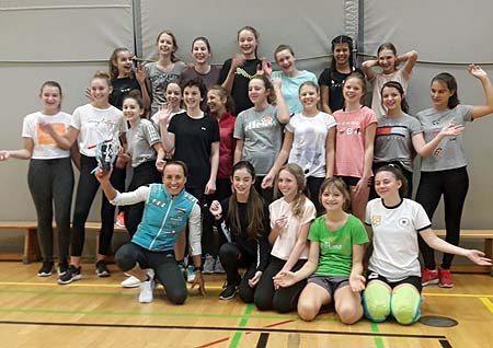 Alle fühlten sich deshalb sehr geehrt, dass Anne Haug unserer Schule einen Besuch abstattete und im Sportunterricht vorbeischaute. Nachdem die überaus sympathische Sportlerin am Anfang der Stunde die vielen Fragen der Schülerinnen zu Tagesablauf, Ernährung und Motivation beantwortet hatte, ging es dann für alle zum Praxisteil. Und obwohl sich Anne Haug am Vortag beim Training eine Bänderverletzung zugezogen hatte, ließ sie es sich nicht nehmen, alle Übungen selbst vorzumachen.
