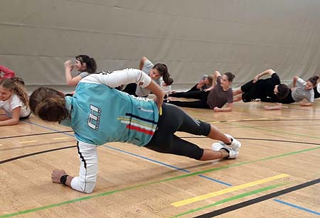 Bevor das sogenannte Lauf-ABC an die Reihe kam, wurden erst einmal Rumpfkraft und Koordination trainiert und die Schülerinnen merkten ziemlich schnell, dass die Übungen gar nicht so leicht waren, wie sie bei Anne Haugs Demonstrationen noch aussahen.