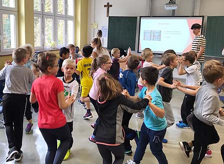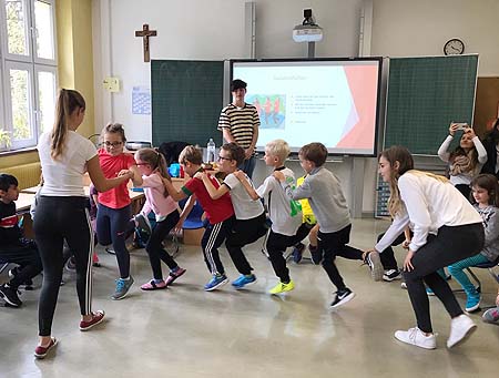 An diesem Tag sollte es aber auch darum gehen, wie man kurze Bewegungseinheiten in den Unterrichtsvormittag integrieren kann, um wieder Energie für den anstrengenden Unterrichtsalltag zu tanken. Diese kleinen Spiele haben die Kinder zusammen mit den Oberstufenschülern ausprobieren dürfen.