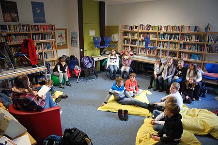 Doch auch wer mit seiner Klasse lediglich das Klassenzimmer als Vorleseort gewählt hatte, konnte es sich dort mindestens ebenso gemütlich machen: Die bunten Sitzsäcke als zusätzlich herbeigeschaffte Sitzgelegenheiten waren dabei eine willkommene Gelegenheit, sich bequem zurückzulehnen, einmal die Gedanken schweifen zu lassen, um neugierig und interessiert den Abenteuern und Geschichten in entspannter Atmosphäre lauschen zu können.
