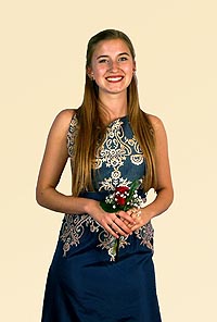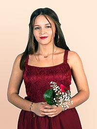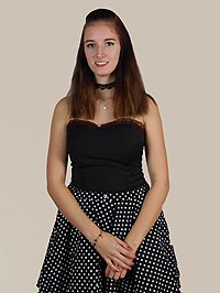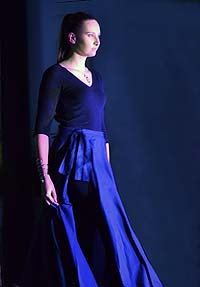 Die Schülerin Amelie Rohmer ließ sich ebenfalls von der orientalischen Kultur inspirieren, wobei sie allerdings eine moderne Interpretation kreierte. Die dunklen Farben des Oberteils und des Rocks erinnern an traditionelle Wüstengewänder. Gleichzeitig entsteht ein Gegensatz da die goldenen Ornamente einen Kontrast zum dunklen Untergrund bilden. Als modernes Element ist der Schnitt des Kleides zu nennen. Von Vorne ist das Kleid hochgeschlossen und schlicht, während der Rücken frei liegt und sich somit vom traditionellen Schnitt abhebt. Die auf dem Rücken gekreuzten Träger geben dem feierlichen Kleid einen verspielten Akzent. Der Schmuck ist passend zu den goldenen Ornamenten ebenfalls in Gold gehalten.