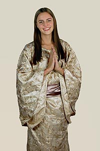 Der nächste Kontinent, den wir bereisen werden ist Asien. Zur traditionellen Kleidung Japans und China gehört der Kimono, der eine jahrhundertelange Geschichte besitzt. Die klassischen Farben des Kimonos sind Rot und Gold, welche charakteristisch für das chinesische Neujahrsfest sind. Traditionell werden zu diesem besonderen Anlass rote Laternen aufgehängt. Gleichzeitig verkleiden sich die Menschen in goldenen Drachenkostümen, da der Drache eine große Bedeutung in der chinesischen Kultur spielt. Die Schülerin Lisa Rieß präsentiert ihren Kimono als eine moderne Interpretation, da der traditionell breite Gürtel hier eher schmal gehalten ist um den vollen Fokus auf die Ärmel zu halten. Die Vermischung der Kulturen China und Japan wird auch hier wieder deutlich, da sowohl das traditionelle Drachenmotiv als auch die Blüten des japanischen Kirschbaumes auf den Ärmeln zu finden ist. Meine Damen und Herren ich wünsche Ihnen einen angenehmen Aufenthalt!