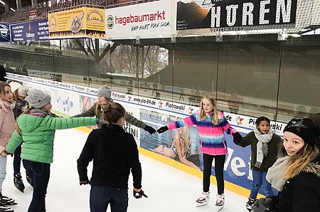 Außerdem ging es zum Eislaufen. Die 22 Jungen und Mädchen schnürten sich d beim gemeinsamen Eislaufen im Städtischen Eisstadion. Auch für das leibliche Wohl war dabei bestens gesorgt.