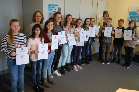 Für erfolgreiche Teilnahme bei der ersten Runde des bayernweiten Schülerwettbewerbs „Experimente antworten“ wurden 13 Schülerinnen und Schüler der 5. Klassen ausgezeichnet und erhielten Urkunden aus der Hand von der Schulleiterin Frau Graf.