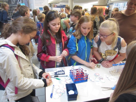 Um uns Schülerinnen und Schülern den Besuch möglichst interessant zu gestalten, erhielten wir bereits im Eingangsbereich einen Fragebogen mit vielen Rätseln. Die dort befindlichen Ausstellungsstände boten einen Überblick über die verschiedenen Wissenschaftszweige. So wurden unterschiedliche Themen, wie zum Beispiel Mikrobenflüsterer, Batterien der Zeit, Spieltheorien usw. vorgestellt.