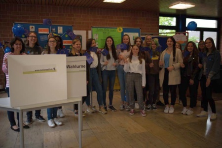 Die ersten Schüler drängen sich in das „Wahllokal“, wo sie ihre Wahlbenachrichtigung abgeben und ihr Ausweis kontrolliert wird. Kurz darauf gehen sie mit einem Stimmzettel in eine der Wahlkabinen, um dort geheim eine der 41 Parteien zu wählen. Dann wird der Stimmzettel zweimal gefaltet und ist auch schon in der Wahlurne verschwunden. So bekommt auch jeder Wähler die Chance, an dem EU-Quiz der Klasse 10e teilzunehmen. Gewinner wird einer derjenigen, der die Fragen richtig beantwortet hat. Dieser darf sich über einen Kinogutschein freuen.