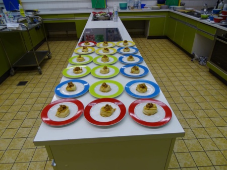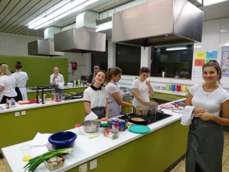 Als dritter Gang gab es amerikanische Hawaiian Rolls, auf die ein mediterraner Salat mit Tintenfischen folgte. Die Hauptspeise bestand aus einem afrikanischen Erdnusseintopf und den Nachtisch bildete ein südamerikanischer Brotpudding. Die Gerichte wurden stilecht von einem Serviceteam aus Schülerinnen serviert, welches sich den gesamten Abend um die Gäste kümmerte. In der Küche ging es manchmal etwas hektisch zu, doch mit viel Teamwork und Gelassenheit gingen alle Gänge gut und rechtzeitig raus. Nachdem das ganze Menü serviert war, war die Erleichterung groß den Abend ohne größere Missgeschicke überstanden zu haben. Von den Gästen erhielten wir viel Lob, Applaus und den ein oder anderen Wunsch nach einer Wiederholung.