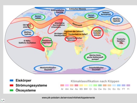 Zudem wurden sogenannte Kipppunkte (z.B. die Abholzung im Regenwald von Amazonien, das Abschmelzen des grönländischen Eisschildes oder das Freiwerden von Methanhydraten aus den Tiefen der Ozeane) erforscht.