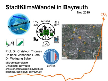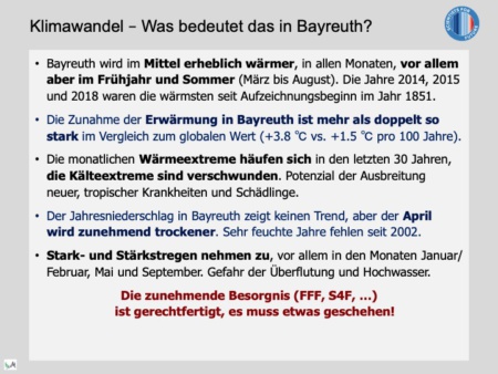 Da kam das Angebot von Herrn Dr. Lüers von der Abteilung Mikrometeorologie der Uni Bayreuth gerade richtig, von den Forschungsergebnissen des Lehrstuhls zu den Auswirkungen auf die Stadt Bayreuth und das nähere Umland anzubieten.