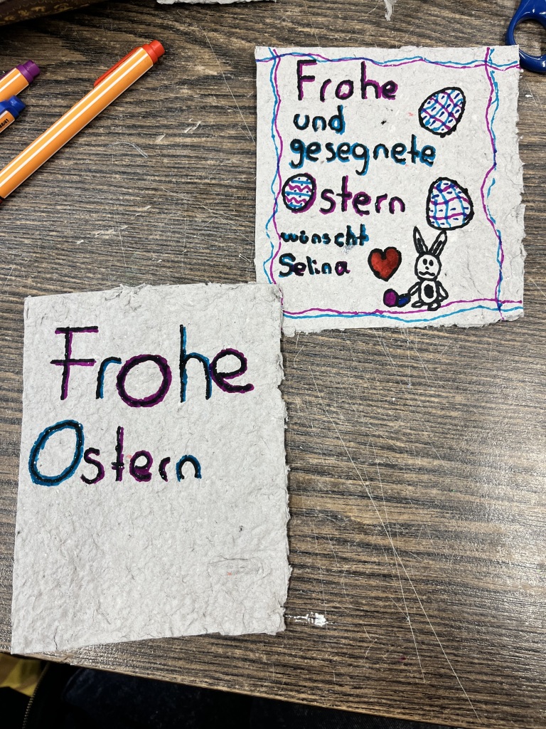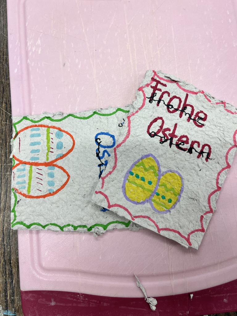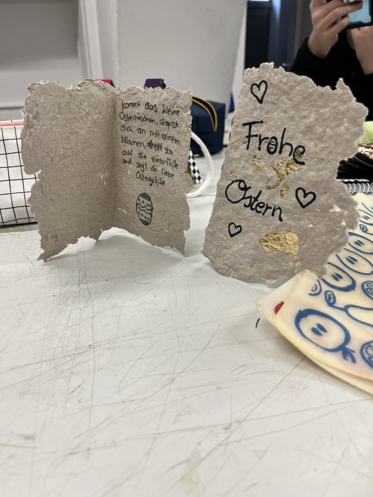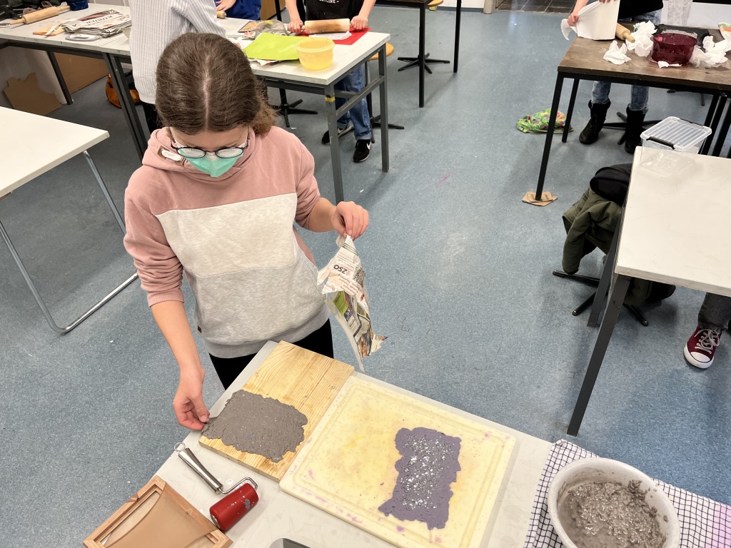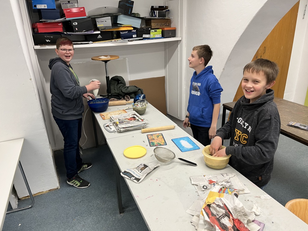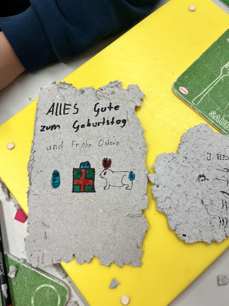 Das Referat einer Schülerin über die Herstellung und Geschichte des Papiers entwickelte sich in der Klasse 6b zu einem spannenden Schulprojekt. Nachdem fleißig recherchiert wurde, wie man Papier selbst recyceln kann, wuchs schnell die Idee heran, eigene Ostergrußkarten für die Liebsten zuhause herzustellen und zu gestalten. Glücklicherweise steht am RWG die „Blaue Grotte“ für solche Projekte zur Verfügung. Hier wurde altes Zeitungspapier in Wasser aufgeweicht und anschließend ganz fein mit einem Stabmixer püriert. Dann wurde der Papierbrei durch ein feines Sieb geschöpft und anschließend auf Brettern ausgelegt, gepresst und getrocknet. Die kreativen Schüler verzierten ihr Papier mit Glitzer, getrockneten Blumen, Lavendelsamen und anderen tollen Materialien. Schließlich wurde das Papier für zwei Tage zum Trockenen auf den Fensterbänken ausgelegt. Das Ergebnis begeisterte alle Beteiligten und so wurden die Papierrohlinge abschließend noch zugeschnitten und mit lieben Ostergrüßen versehen. Sicherlich freuen sich nun viele Eltern, Geschwister, Freunde und Verwandte über die selbsthergestellten Ostergeschenke.