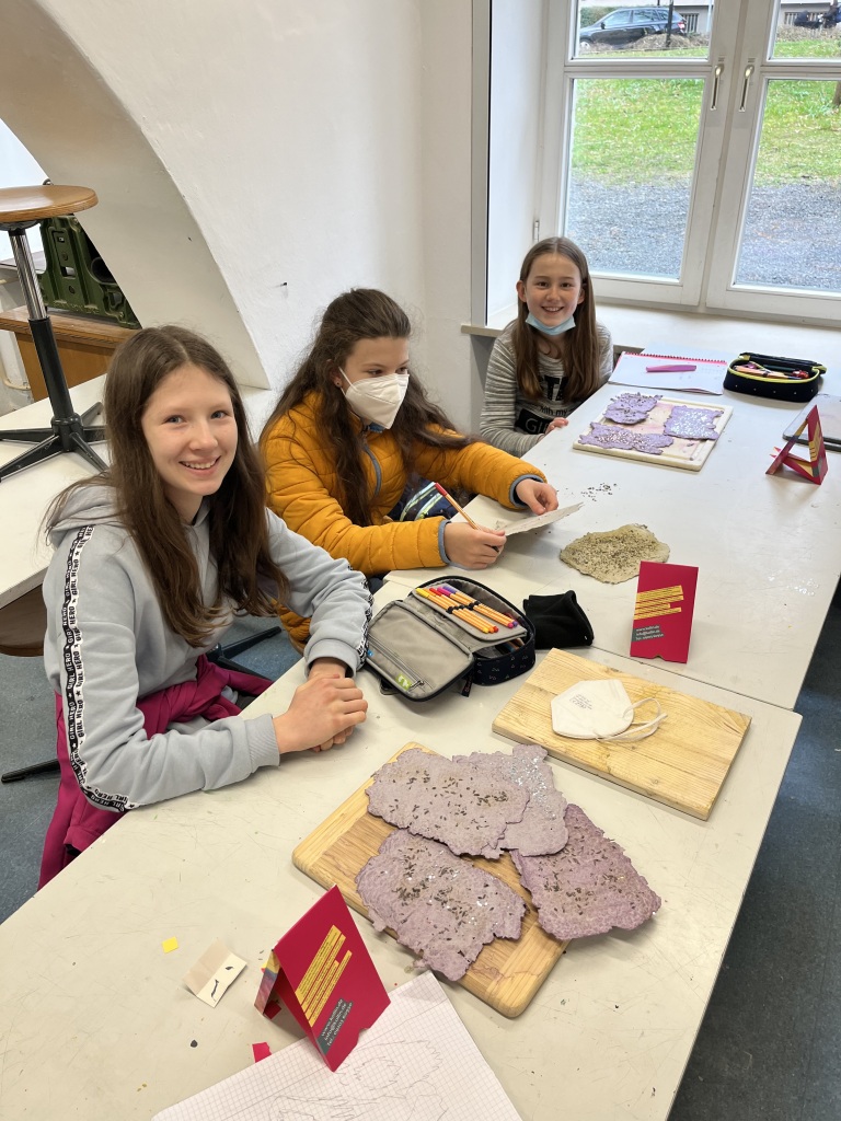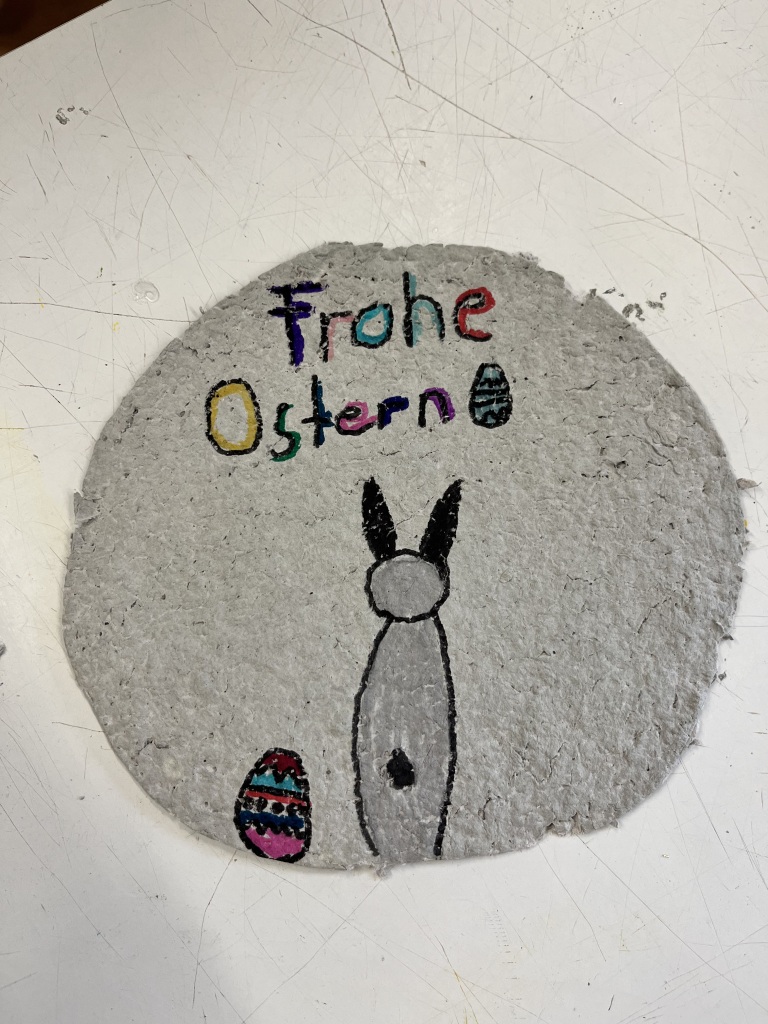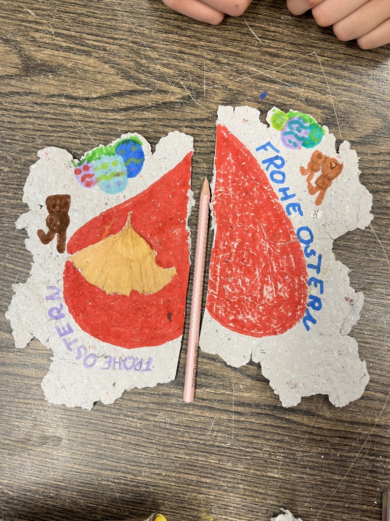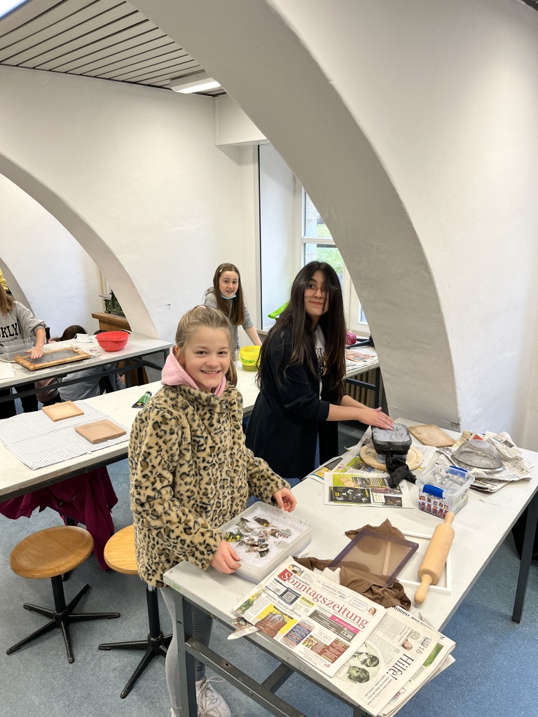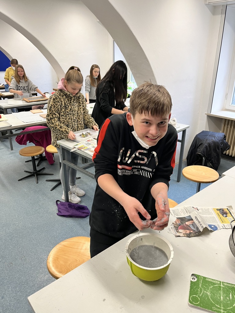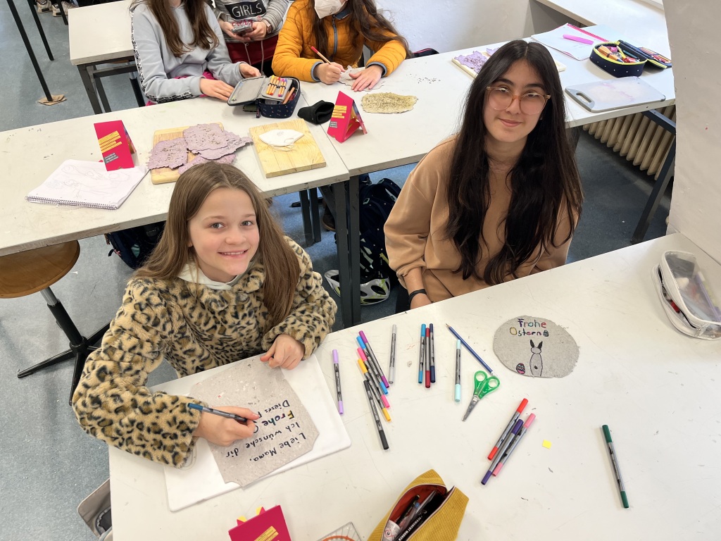 Das Referat einer Schülerin über die Herstellung und Geschichte des Papiers entwickelte sich in der Klasse 6b zu einem spannenden Schulprojekt. Nachdem fleißig recherchiert wurde, wie man Papier selbst recyceln kann, wuchs schnell die Idee heran, eigene Ostergrußkarten für die Liebsten zuhause herzustellen und zu gestalten. Glücklicherweise steht am RWG die „Blaue Grotte“ für solche Projekte zur Verfügung. Hier wurde altes Zeitungspapier in Wasser aufgeweicht und anschließend ganz fein mit einem Stabmixer püriert. Dann wurde der Papierbrei durch ein feines Sieb geschöpft und anschließend auf Brettern ausgelegt, gepresst und getrocknet. Die kreativen Schüler verzierten ihr Papier mit Glitzer, getrockneten Blumen, Lavendelsamen und anderen tollen Materialien. Schließlich wurde das Papier für zwei Tage zum Trockenen auf den Fensterbänken ausgelegt. Das Ergebnis begeisterte alle Beteiligten und so wurden die Papierrohlinge abschließend noch zugeschnitten und mit lieben Ostergrüßen versehen. Sicherlich freuen sich nun viele Eltern, Geschwister, Freunde und Verwandte über die selbsthergestellten Ostergeschenke.