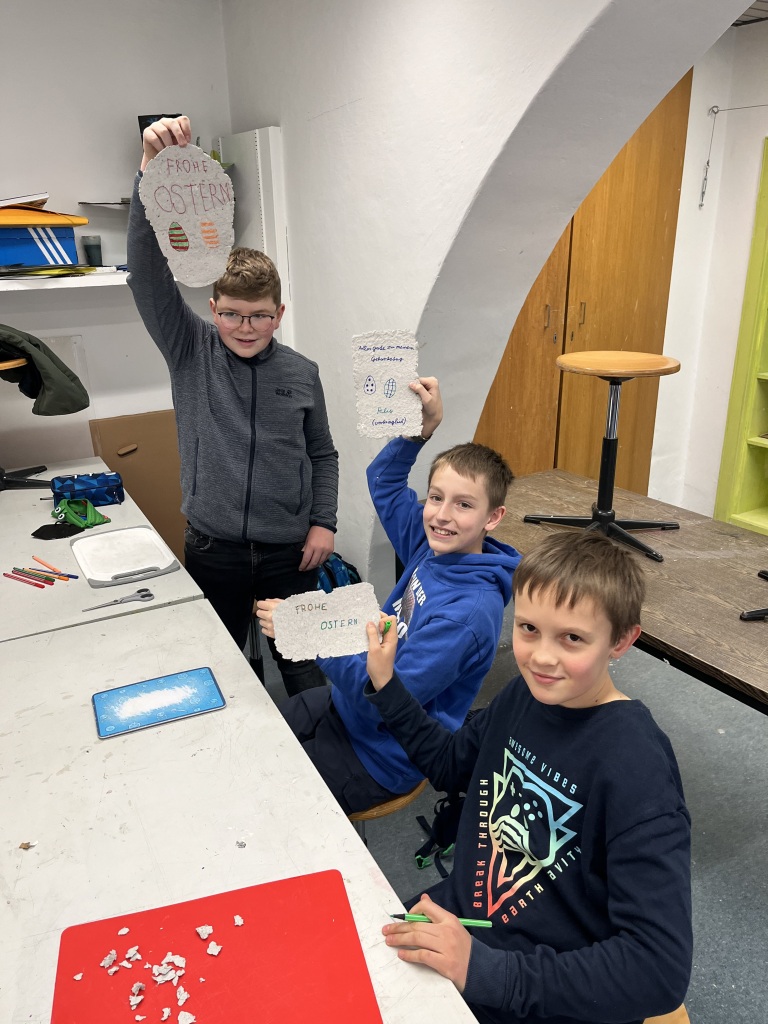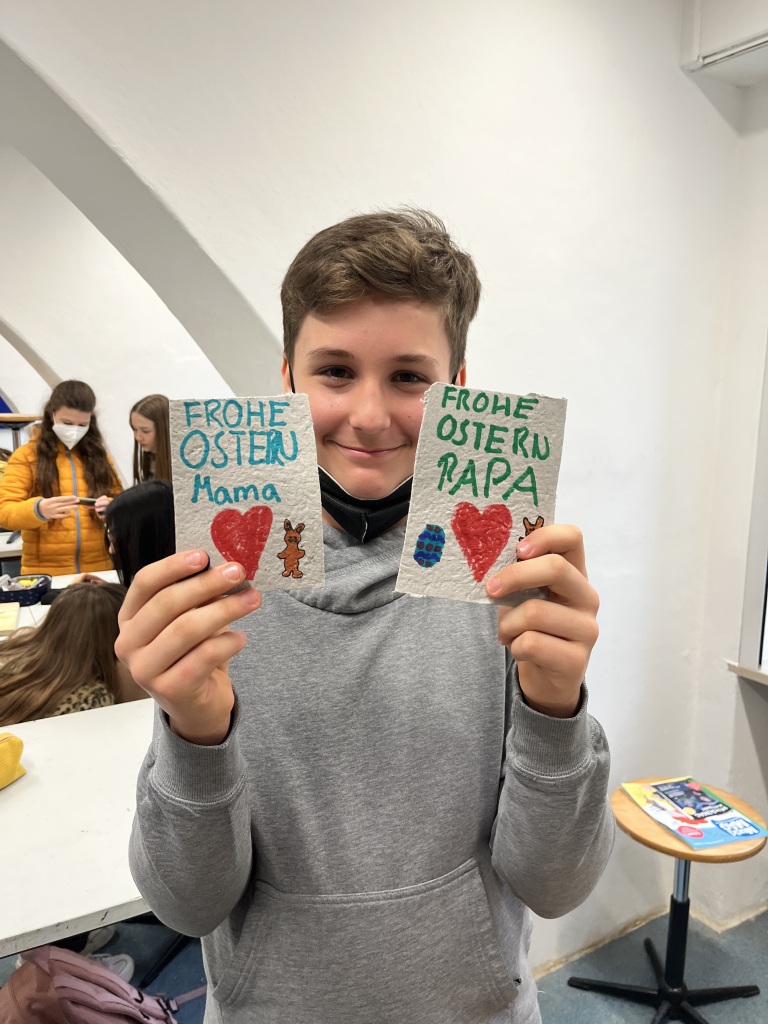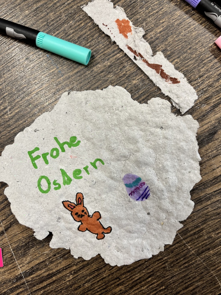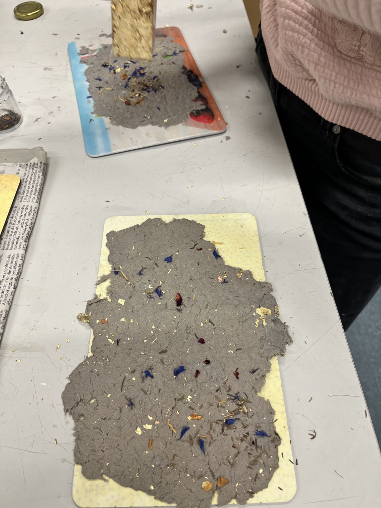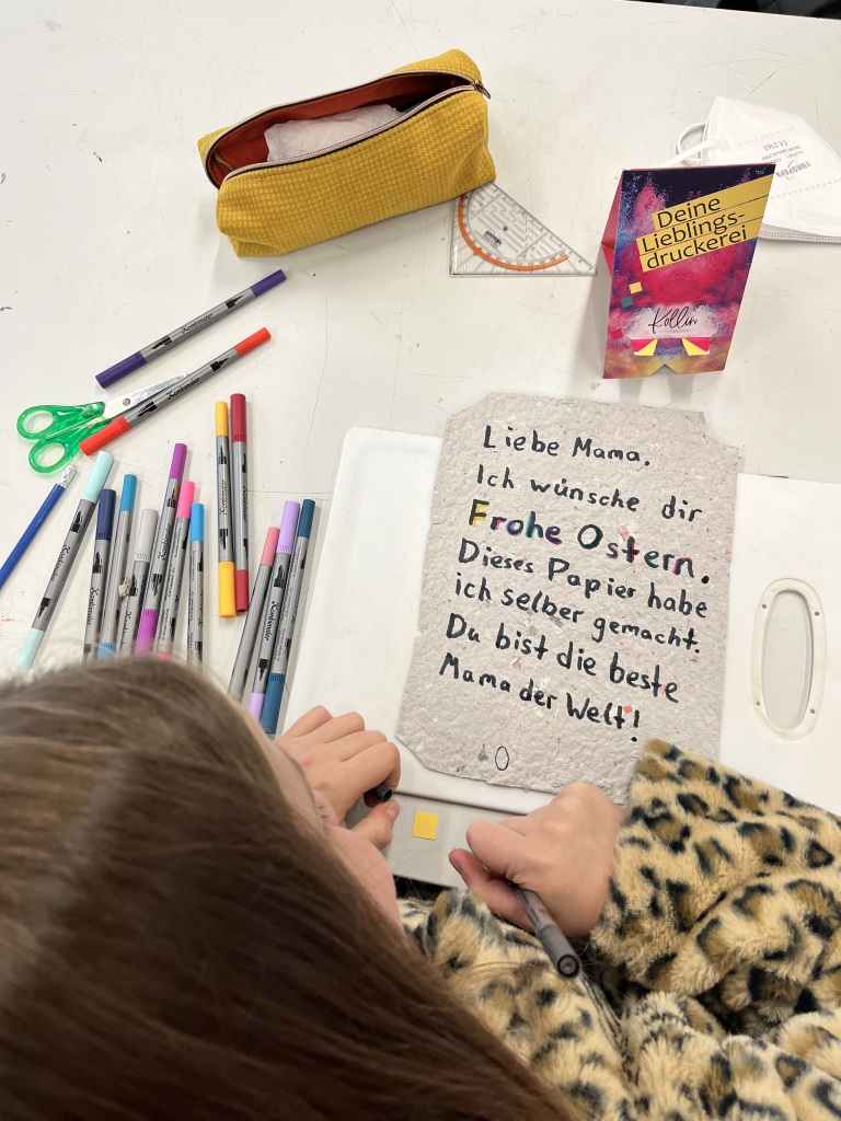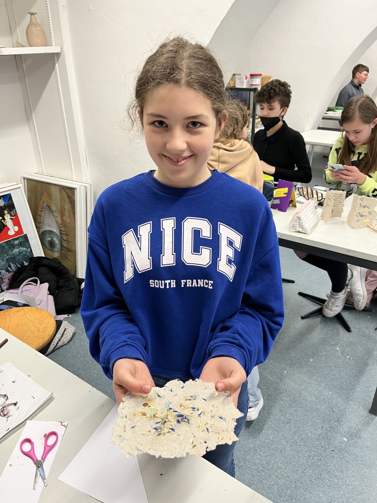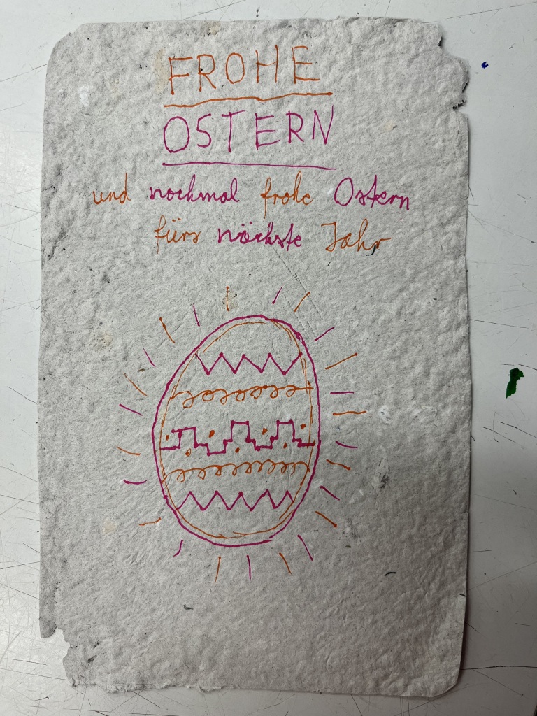 Das Referat einer Schülerin über die Herstellung und Geschichte des Papiers entwickelte sich in der Klasse 6b zu einem spannenden Schulprojekt. Nachdem fleißig recherchiert wurde, wie man Papier selbst recyceln kann, wuchs schnell die Idee heran, eigene Ostergrußkarten für die Liebsten zuhause herzustellen und zu gestalten. Glücklicherweise steht am RWG die „Blaue Grotte“ für solche Projekte zur Verfügung. Hier wurde altes Zeitungspapier in Wasser aufgeweicht und anschließend ganz fein mit einem Stabmixer püriert. Dann wurde der Papierbrei durch ein feines Sieb geschöpft und anschließend auf Brettern ausgelegt, gepresst und getrocknet. Die kreativen Schüler verzierten ihr Papier mit Glitzer, getrockneten Blumen, Lavendelsamen und anderen tollen Materialien. Schließlich wurde das Papier für zwei Tage zum Trockenen auf den Fensterbänken ausgelegt. Das Ergebnis begeisterte alle Beteiligten und so wurden die Papierrohlinge abschließend noch zugeschnitten und mit lieben Ostergrüßen versehen. Sicherlich freuen sich nun viele Eltern, Geschwister, Freunde und Verwandte über die selbsthergestellten Ostergeschenke.