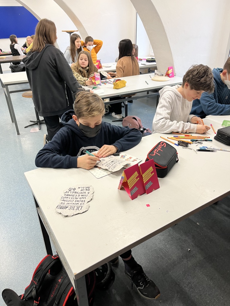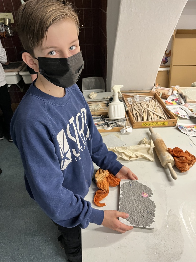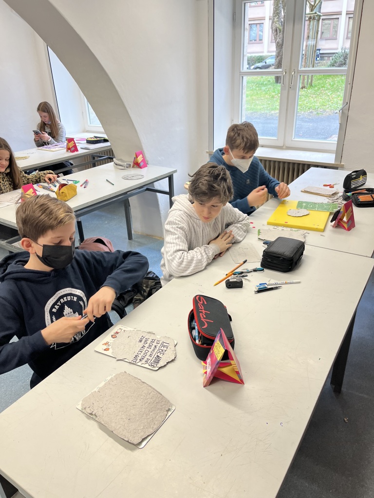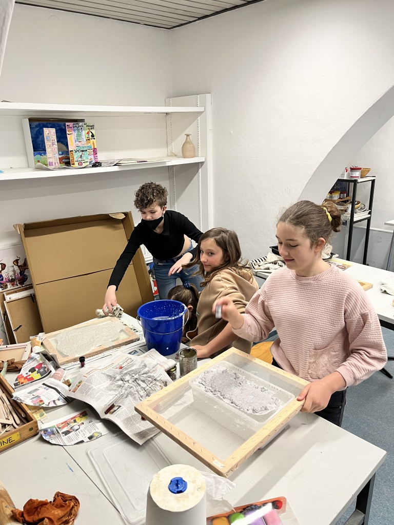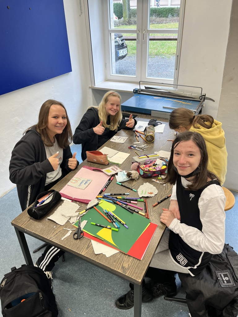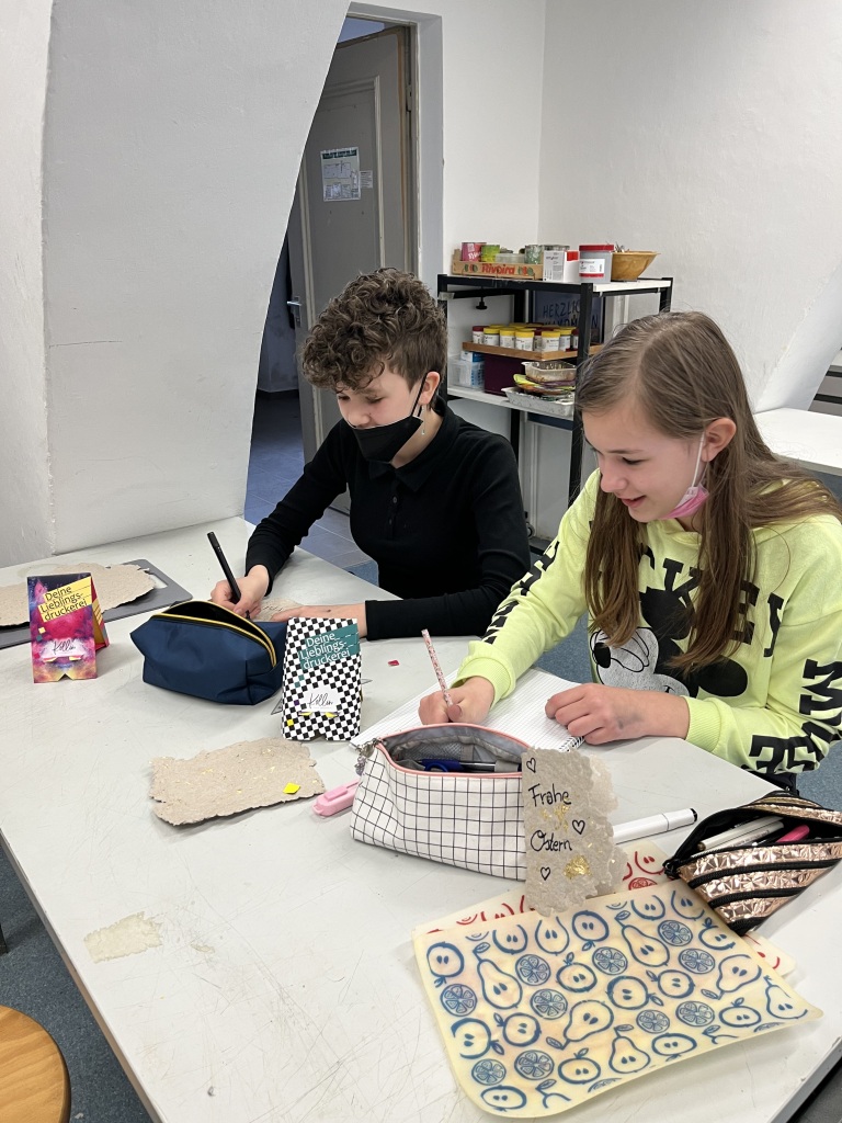 Das Referat einer Schülerin über die Herstellung und Geschichte des Papiers entwickelte sich in der Klasse 6b zu einem spannenden Schulprojekt. Nachdem fleißig recherchiert wurde, wie man Papier selbst recyceln kann, wuchs schnell die Idee heran, eigene Ostergrußkarten für die Liebsten zuhause herzustellen und zu gestalten. Glücklicherweise steht am RWG die „Blaue Grotte“ für solche Projekte zur Verfügung. Hier wurde altes Zeitungspapier in Wasser aufgeweicht und anschließend ganz fein mit einem Stabmixer püriert. Dann wurde der Papierbrei durch ein feines Sieb geschöpft und anschließend auf Brettern ausgelegt, gepresst und getrocknet. Die kreativen Schüler verzierten ihr Papier mit Glitzer, getrockneten Blumen, Lavendelsamen und anderen tollen Materialien. Schließlich wurde das Papier für zwei Tage zum Trockenen auf den Fensterbänken ausgelegt. Das Ergebnis begeisterte alle Beteiligten und so wurden die Papierrohlinge abschließend noch zugeschnitten und mit lieben Ostergrüßen versehen. Sicherlich freuen sich nun viele Eltern, Geschwister, Freunde und Verwandte über die selbsthergestellten Ostergeschenke.