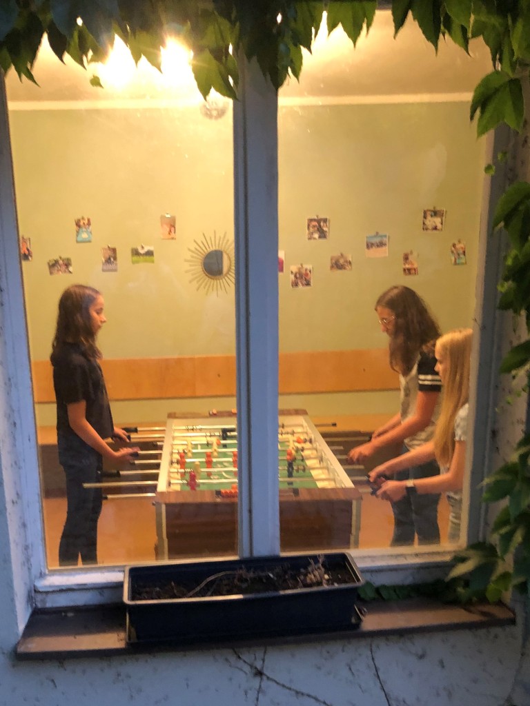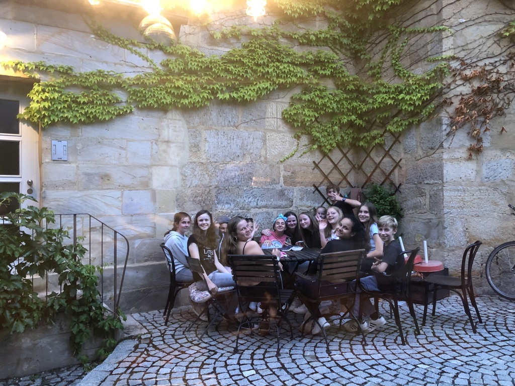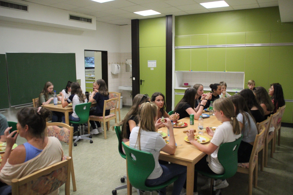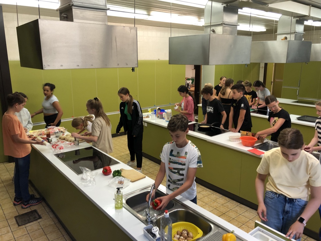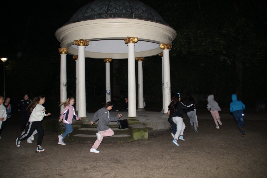 Um 17.00 Uhr trafen sich die Schüler*innen im Pausenhof, stellten ihr Gepäck im Lesenden Klassenzimmer ab und gingen in die Obere Bibliothek, um dort Aufgaben zum Thema Sagen zu bearbeiten. Danach aßen die Sechstklässler*innen das Essen, das sie zuhause vorbereitet hatten, in der Schulküche. Als alle damit fertig waren, liefen sie mit ihrem Gepäck zum Café Adebar, damit sie dort ihre Bettenlager aufbauen konnten. Dann spielten sie Gemeinschaftsspiele. Anschließend machten die Schüler*innen eine Nachtwanderung durch den Hofgarten, bei der ihre Klassenlehrerin, Frau Keyser, regionale Sagen erzählte. Als sie wieder beim Café Adebar ankamen, hatten sie noch eine Stunde Zeit sich zu unterhalten. Danach gingen alle ins Bett und durften, wenn sie wollten, noch in ihren Büchern lesen. Am nächsten Morgen standen sie auf, räumten ihre Nachtlager auf und gingen zurück in die Küche des RWGs, um ihr Frühstück zu essen und sich noch einmal mit Sagen zu beschäftigen. Dann kochten sie ihr Menü für das RWG-Kochbuch. Während das Erdbeertiramisu im Kühlschrank war, spielten die Schüler*innen Giraffenball. Danach aßen sie das Menü, bis sie dann um 11.50 Uhr abgeholt wurden.