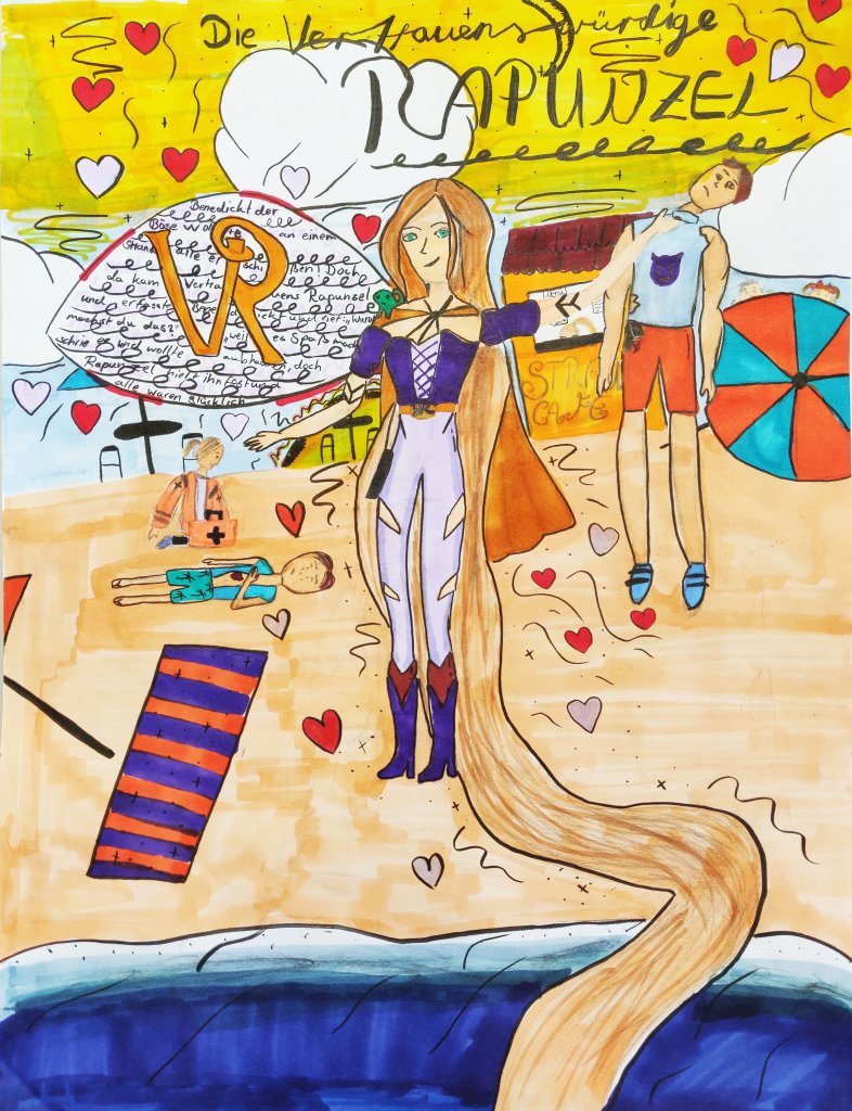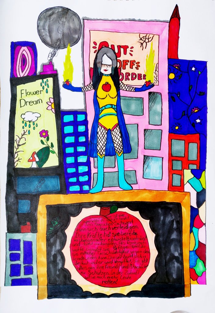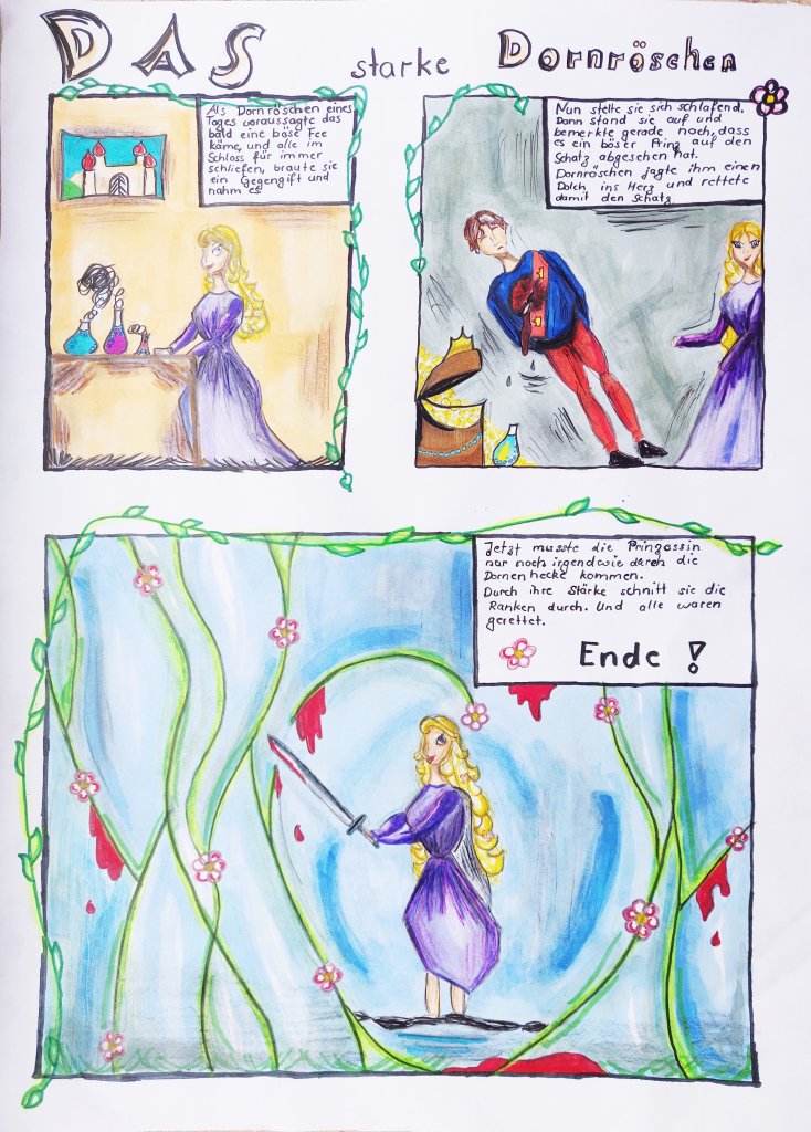 Da gab es zum Beispiel das Märchen Schneewittchen der Gebrüder Grimm, welches unter dem Motto einer Umformung der ursprünglichen Ideen stand. Zugrunde lag der emanzipatorische Gedanke, dass Prinzessinnen vielleicht nicht immer gerettet werden wollen und gerne selbst dazu die Initiative ergreifen. Zudem könnten Prinzen durchaus auch einmal Hilfe gebrauchen. Die bekannten europäischen Märchen wurden von unseren GewinnerInnen zunächst auf die Eigenschaften ihrer Heldenfiguren untersucht, bevor sie neue Geschichten erfunden haben. Es wurden die eigenen Ideen in eine comichafte Heldendarstellung in Klasse 6 oder nach der Erstellung in einen Scherenschnitt von den SchülerInnen unserer Klasse 5 in eine Stop-Motion Animation umgewandelt. Die Gewinnerfilme können auf unserer Homepage angeschaut werden.