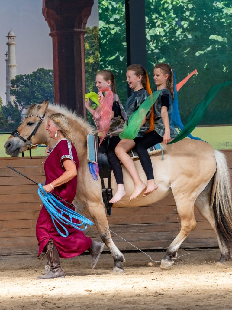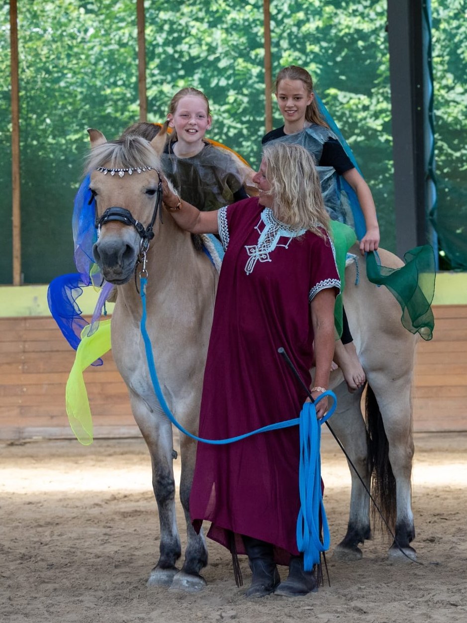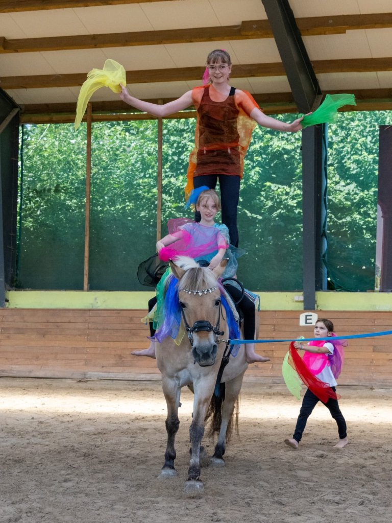 Der bunte Tanz, der zunächst am Boden begann, setzte sich dann auf dem Pferd fort. Ob im Stehen, im Knien, im Schneidersitz oder bei der „Fahne“ oder „Mühle“ auf dem Pferderücken, beständig wurden die Tücher geschwungen, so dass sich ein farbenfrohes sommerleichtes Bild ergab. Neben den Reitvorführungen und dem Alpaka Pas de Deux sorgten die Reiterinnen auf ihren Steckenpferden für eine heitere Stimmung.