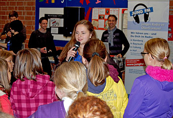 Nicht schlecht staunten unsere Schüler, als sie die obere Pausenhalle in ein Radiostudio verwandelt vorfanden: Das Bayreuther Jugendradio JungFM Funkloch war zu Gast am RWG.