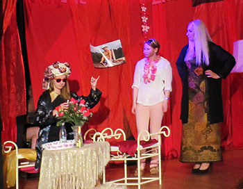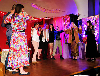 Aufs Äußerste strapazierte die Theatergruppe der 10. Klasse und der Q11 die Lachmuskeln ihres Publikums: „Unter Bademänteln – Eine Posse in Plüschpantoffeln“ hieß ihre Aufführung in der Aula.