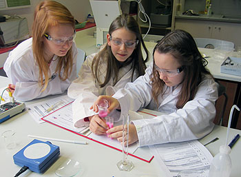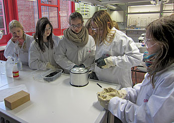 Die Analytik-Gruppe untersuchte derweilen die chemischen Eigenschaften von LEGO-Steinen und ihren Bestandteilen, Butadien und Acrylnitril. Mit Hilfe von diversen Geräten und Chemikalien, ausgestattet mit Labormänteln, Schutzbrillen und Gummihandschuhen wurden LEGO-Steine aufgelöst und dann verschiedene Versuche durchgeführt. Nach einer Stunde tauschten die Gruppen. Im Plenum wurden die Ergebnisse präsentiert und diskutiert.