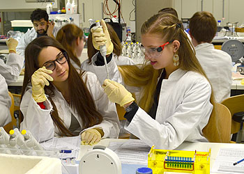 Die SchülerInnen eines Q11 Kurses Biologie konnten die Polymerase-Kettenreaktion im Demonstrationslabor für Gentechnik an der Universität Bayreuth selbst durchführen. Dazu wurde zuerst menschliches Erbgut isoliert, dann durch die PCR vervielfältigt („amplifiziert“) und anschließend sichtbar gemacht.