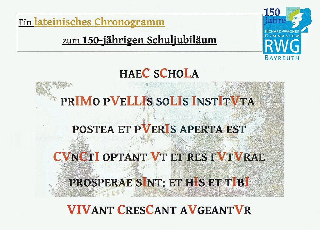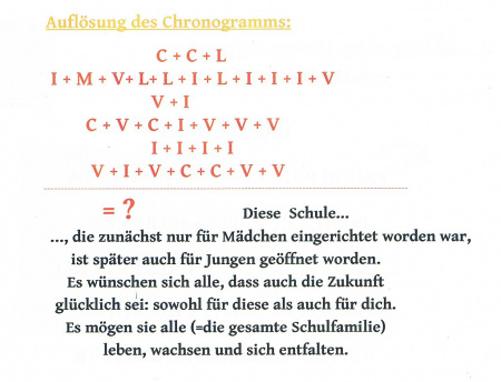 Chronogramme werden überwiegend zum Zeitpunkt des Ereignisses angefertigt, sie können aber auch retrospektiv als Merkspruch oder Memorialzahl entstehen; somit schien das Jubiläumsjahr der Schule nahezu perfekt für diesen Anlass!
