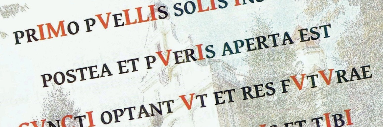 Entstanden ist dabei ein sechszeiliges Chronogramm, ein Sinnspruch oder eine Inschrift in lateinischer Sprache; zu sehen ist diese Tradition, die im Mittelalter aufkam und besonders in der Renaissance- und Barockzeit sehr beliebt war, des Öfteren auch auf Bau- oder Kunstdenkmälern, auf Münzen oder Medaillen. Als Bayreuther Beispiel könnte man an dieser Stelle etwa auf das Spruchband am oberen Sockelrand des Markgrafenbrunnens vor dem Neuen Schloss verweisen, das als Chronogramm das Jahr der Errichtung des Brunnens (1705) in sich trägt.