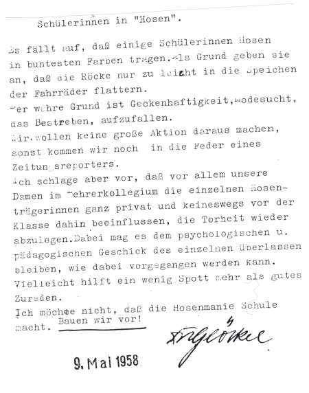 Am 9. Mai 1958 hing dann der legendäre Aushang im Lehrerzimmer, mit dem sich der Schulleiter gegen die neue „Hosenmanie“ positionierte. Vorsichtshalber setzte er die Unaussprechlichen in Anführungszeichen: