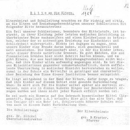 Aber der Schulleiter ließ es nicht mit diesem internen Aushang sein Bewenden haben. Er versicherte sich des Beistands von Pfarrer Kraeter vom Elternbeirat. Gemeinsam wendeten sie sich im gleichen Schuljahr in einer „Bitte an die Eltern“ an die Erziehungsberechtigten. Allerdings ruderten sie nun schon vorsichtig zurück: Im Rundschreiben wird nur noch die „auffallende Übertreibung in modischer Hinsicht“ angeprangert, aber alle wussten, wovon die Rede war. Zudem wurde in der Bitte unmissverständlich der Einsatz der bewährten weiblichen kosmetischen Hilfsmittel wie Lippenstift, Nagellack „u. ä.“ kritisiert: