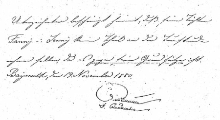 Unterzeichneter bescheinigt hiermit, daß seine Töchter Fanny und Jenny keinen Theil an der Turnstunde nehmen sollen, da es gegen seine Grundsätze ist. Bayreuth, den 19. November 1880. Unterschrift – Großmann: Werden dispensiert!