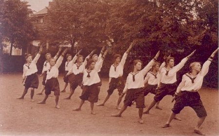 Schülerinnen der 2. (6.) Klasse 1940 in kurzen Turnhosen. Die Turntracht galt nun als „elitär“ und wurde nach 1933 nicht mehr getragen.