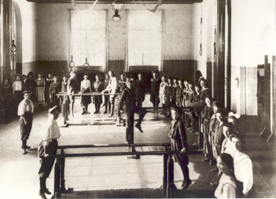 In Turntracht beim Geräteturnen in der Aula. Aufnahme um 1910