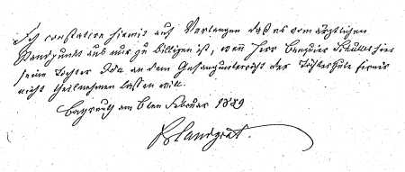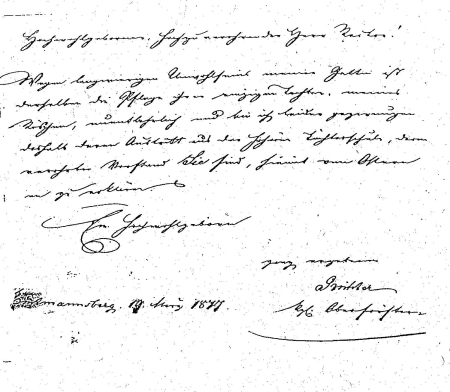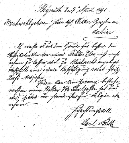 Während meines letzten Aufenthaltes in Bayreuth wurde mir von Seite meiner Tochter Pauline sehr häufig geklagt, daß sie stark an Kopfweh leide. Ich sehe mich daher veranlaßt, Euer Wohlgeboren ergebenst zu bitten, sie vom Auswendiglernen der Oden Klopstocks zu dispensieren, da dies für sie eine Anstrengung ist, mit der ich mich in billiger Berücksichtigung ihrer Gesundheit nicht einverstanden erklären kann. Zugleich erlaube ich mir, Euer Wohlgeboren in Kenntnis zu setzen, daß ich von Ostern an meine Tochter nur mehr an einzelnen Lehrstunden teilnehmen zu lassen beabsichtige, da dieselbe von Tag zu Tag ihrer Mutter im Hause nötiger wird.