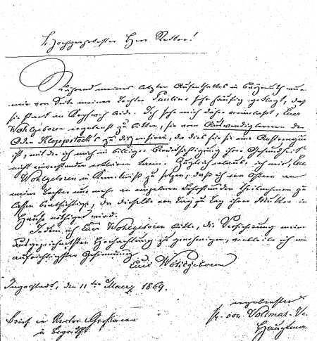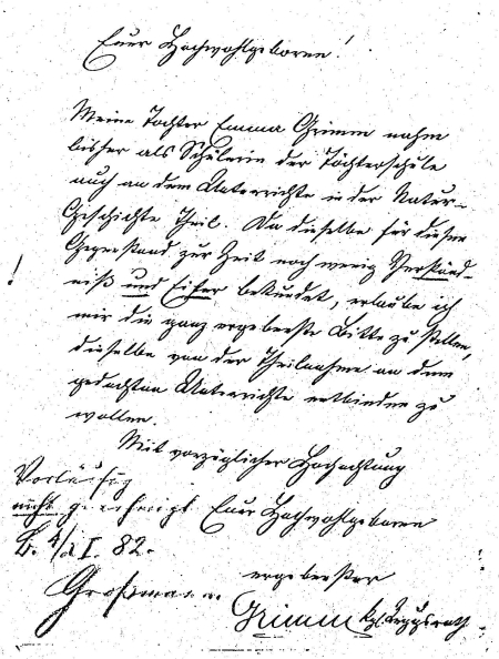 Wegen langwierigen Unwohlseins meiner Gattin ist derselben die Pflege ihrer einzigen Tochter, meines Röschens, unentbehrlich und ich bin leider gezwungen deshalb deren Austritt aus der Höheren Töchterschule, deren verehrter Vorstand Sie sind, hiemit von Ostern an zu erklären.