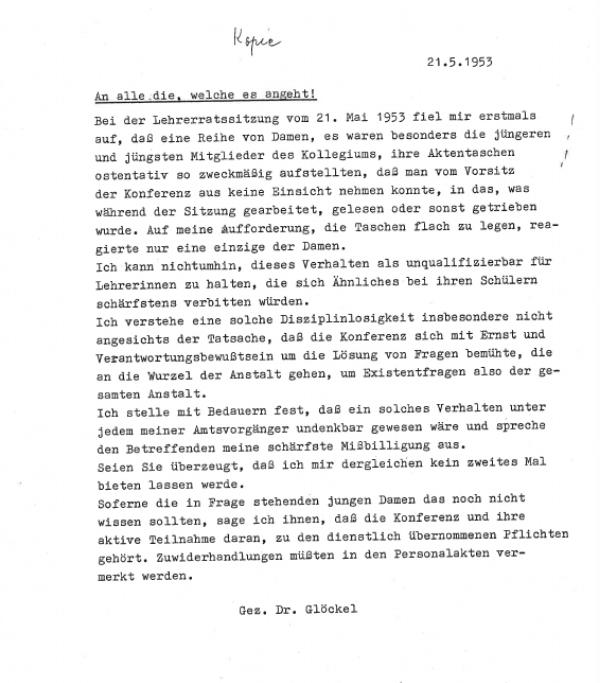 Die Vorgänge während der Lehrerratssitzungen brachten das Fass jedoch zum Überlaufen. Der Direktor konstatierte einen empörenden Mangel an Schulzucht, insbesondere bei den Lehrerinnen, den er umgehend in einem seiner legendären Rundschreiben unnachsichtig geißelte. Während er sich auf den Sitzungen „um Existentfragen (sic) der gesamten Anstalt“ bemühte, trieben die jungen Frauen ihr Allotria -! Abgründe taten sich auf, schwerste dienstliche Verfehlungen deuteten sich an, deren weiteres Vorkommen Eingang in die „Personalakten“ finden würde.