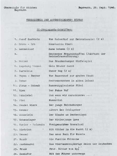 Daher mussten notgedrungen die vorhandenen Bücher überprüft und, falls es keine Beanstandungen gab, wieder für den Unterricht zugelassen werden. Diese Anordnung des neu aufgestellten Kultusministeriums erreichte am 22. Oktober 1945 auch das Direktorat der Schule. Das Mädchengymnasium reichte nun als einer der vielen Antragsteller insgesamt die Titel von 2509 Bücher zur Überprüfung ein, die daraufhin vor allem auf NS-Ideen und auf militaristische Ansichten überprüft wurden. 1047 Bücher, meist mathematischen Inhalts, wurden umgehend, 567 Titel wurden nach Änderungen wieder zugelassen. In der Schule musste jedoch auch ein „Verzeichnis der ausgeschiedenen Bücher“ anlegen, in das beispielsweise eine „Rassenhygienische Fibel“ eingetragen wurde. Dieses Verzeichnis umfasste schließlich 859 (!) Bücher, die nicht mehr benutzt werden durften. Ein besonderes Problem blieb längere Zeit das Fehlen eines geeigneten Geschichtsbuchs, da sich in diesem Fach die Nazis besonders hervorgetan hatten. Aber auch viele Landkarten, Bildquellen und Lesestoffe konnten nicht mehr verwendet werden. Erst ab etwa 1950 gab es wieder eine normale Buchproduktion und nun konnten die Schulbuchsammlung und die Schülerbücherei wieder aufgefüllt werden.