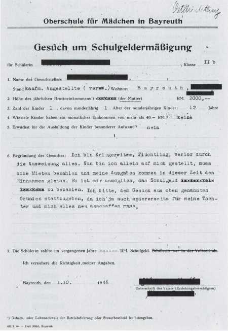 Gesuch für eine Ermäßigung des Schulgelds 1946