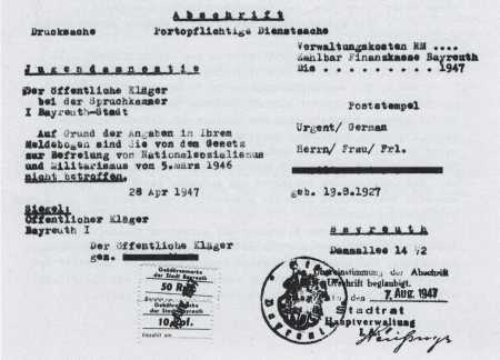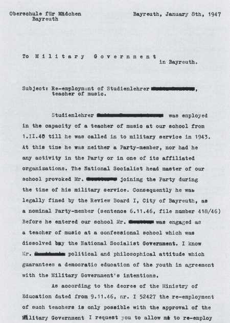 Eine schwere Hürde war die Entnazifizierung der Lehrer. Die Nazis hatten die Ideologisierung der Lehrerschaft stärker als die anderer Berufsgruppen vorangetrieben, um direkten Zugriff auf die jungen Menschen zu bekommen. Bayreuth war zudem der Sitz des „Nationalsozialistischen Lehrerbunds“, die Schulleitungen und viele Lehrer wollten sich in ihrer Gesinnungstüchtigkeit nicht übertreffen lassen. Die belasteten alten Lehrerinnen und Lehrer mussten daher entlassen werden. Aber Ersatz stand nicht zur Verfügung, und auch die in einem Schnellkurs von 12 Monaten ausgebildeten „Schulhelfer“ konnten keine Abhilfe schaffen. Heimatvertriebene Lehrer, die „Flüchtlingslehrer“, wurden nach einem beschleunigten Entnazifizierungsverfahren in den Schuldienst übernommen, Lehramtsanwärter noch in der Ausbildungsphase in den Schulbetrieb eingegliedert. Schließlich musste dann doch wieder auf die zuvor entlassenen Lehrer zurückgegriffen werden. Sie hatten den berühmten Fragebogen auszufüllen und wurden von einer „Spruchkammer“ beurteilt. Wurden sie als „Mitläufer“ eingestuft oder fielen sie unter eine Amnestie, konnte nach einer Stellungnahme durch die Behörden und die Militärregierung eine Wiedereinstellung erfolgen. Im Archiv der Schule findet sich beispielsweise noch ein Beurteilungsschreiben des Schulleiters, der, in englischer Sprache, um ein „re-employment“ eines Lehrers ersuchte. Der Direktor versicherte, dass die betreffende Person nur ein „nominal party-member“ war, als kein aktiver überzeugter NS-Lehrer.
