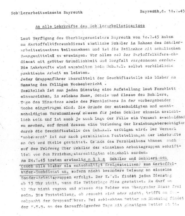 Anweisungen für den ersten „Schülerarbeitseinsatz“ beim „Kartoffelkäfer-Suchdienst“ im Juli 1945 (erste Seite)