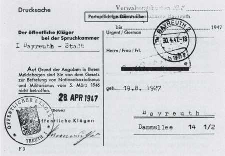 Ein weiteres Hemmnis war die Anordnung der Besatzungsbehörde, dass sich jeder Bürger nur noch in einem engen Umkreis um seinen Wohnort bewegen durfte; die Reise- und Bewegungsfreiheit war aufgehoben. Viele auswärtigen Schülerinnen war damit der Weg nach Bayreuth an die Schule versperrt. Diese Not machte jedoch erfinderisch. Man brauchte eine Erlaubnis für den Schulweg, ein „permit“, und dieses war nur mit einer Begründung erhältlich. Im Schularchiv finden sich daher zahlreiche „permits“, die die Fahrt nach Bayreuth schließlich erlaubten. Beliebt war offenbar die Begründung, dass man in der Stadt Medikamente besorgen musste. Auf diese Weise wurde dann doch der Schulbesuch möglich!