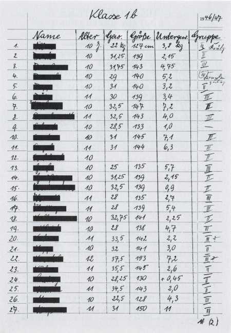Wiegeliste der Klasse 1b im Schuljahr 1946/1947