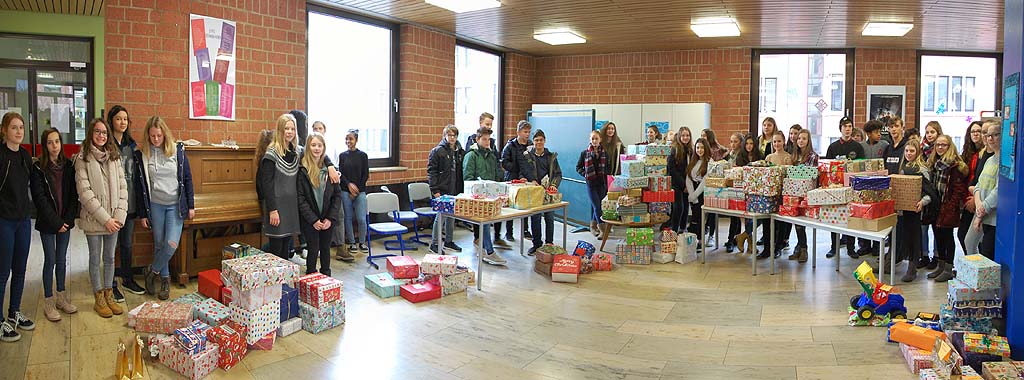 Schon in den Tagen vorher war es sehr schön gewesen zu beobachten, wie der Geschenkestapel im Sekretariat bei Frau Rost wuchs und immer größer wurde: Die Päckchen waren, wie es sich gehört, in buntes Geschenkpapier verpackt und beschriftet. Damit sie unkompliziert ihren Weg dorthin finden, wo sie gebraucht werden, hatte der Verein „Bunt statt braun – Gemeinsam stark für Flüchtlinge e. V.“ Namenslisten zur Verfügung gestellt, die auch Altersangaben enthielten. Die SMV sorgte dafür, dass sich die Schüler in den Klassen ein Flüchtlingskind aussuchen konnten, welches sie mit einem Geschenk bedenken wollten. Das klappte prima.